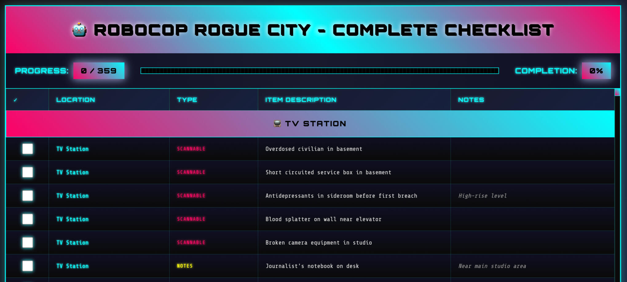 This project was something I developed while replaying Robocop: Rogue City because I couldn't find a straightforward, uncluttered, collectibles guide that let me track my progress. Claude even made it cute for me (with some help).